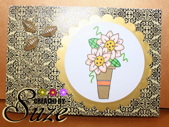 I have used a background paper from Kaisercraft. The image is from Bugaboo Stamps and has been coloured with copic markers. I have also used some gold paper for matting, some gold web-style ribbon and some gold embellishments.