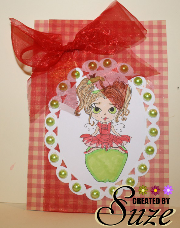I have used a polka dot paper from a paper pad. The image is from Anne Fenton and has been repeated three times. I added a sentiment with an acrylic stamp and Memento Tuxedo Black ink. I also added three pearls from Rosie's Studio.