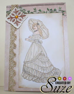The paper I have used comes from a paper pad by Couture Creations called "Vintage Garden". The image is from Ike's Art and is coloured with copic markers E00, E41, E43, E35, E31, R59. I also inked the edges of the image with Distress Ink - Vintage Photo. The lace and embellishment are from my stash (not sure of the brand of either of them).