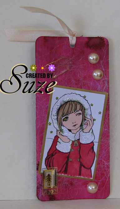 I have used a tag that came with my new swimming togs. I covered it in gesso and then sprayed with Dylusions Ink. I added some Angelina Fibre for texture. The image is from Morgan's Art World and is coloured with copic markers and matted with some gold metallic paper. I also used some pearls from Rosie's Studio, some satin ribbon and some gold christmas stickers.