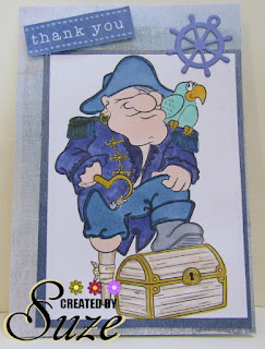 I have used a paper and two borders from a paper pad by Kaisercraft called "Sandy Toes". The image is from Di's Digi Downloads and is coloured with copic markers. Matting is blue cardstock. I also added some pearls and some gems from Sullivans.