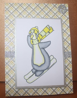The image that I have chosen to work with is Winter Penguin Ski by Bugaboo. I have matted the penguin image onto some pearlised silver cardstock. The embellishments are some silver glitter ribbon from American Crafts and a button cut using a Memory Box die. Not sure if you can pick it up from this photograph but the diagonal silver lines on the background paper are all glittery too.