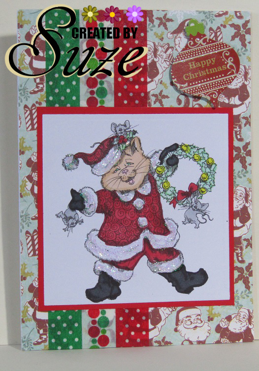 I have used a paper from a christmas paper pad by MME. I added three strips of washi tape. The image is from Rick St Dennis and is coloured with copic markers E53, E51, 100, C7, C2, RV10, G02, G000, R59, R56, Y06 and Kindy Glitz. I matted with red cardstock and added a ornament embellishment as the sentiment.