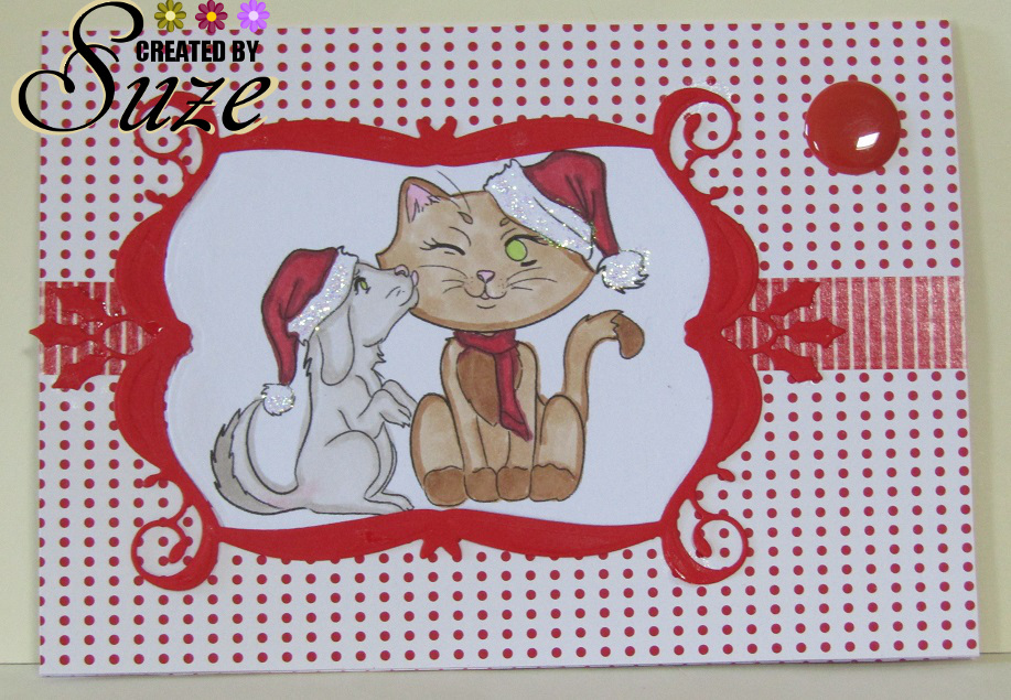 I have used a paper from a christmas paper pad by Sugar and Spice Studio. The image is from Morgan's Art World and is coloured with copic markers and Kindy Glitz. The frame dies are part of a set from Memory Box. I also added a red enamel dot.