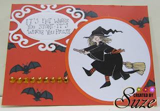 I have used a digital paper from Lozzy. The image is from Eureka Stamps and is coloured with copic markers. The sentiment is from QKR Stampede. I used a fancy Spellbinders die to die-cut the sentiment and a plain circle to cut the image. Matting is orange cardstock. I also added a strip of orange gemstones.