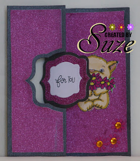 I used a die set from Sissix to cut the silver cardstock and the pink glitter cardstock to create the base. The image is from Di's Digi Downloads and is coloured with copic markers and Wink Of Stella. I die-cut three flowers using a die from Marianne's Designs and added gemstones to the centres. I also added a digital sentiment from Paper Smooches.